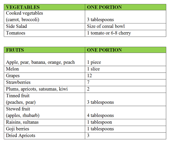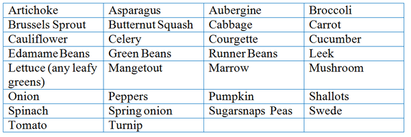 - 2 x cereal bowls of salad/vegetables from the list provided below: (cooking method: blended into soup/boiled/steamed/roasted/raw)