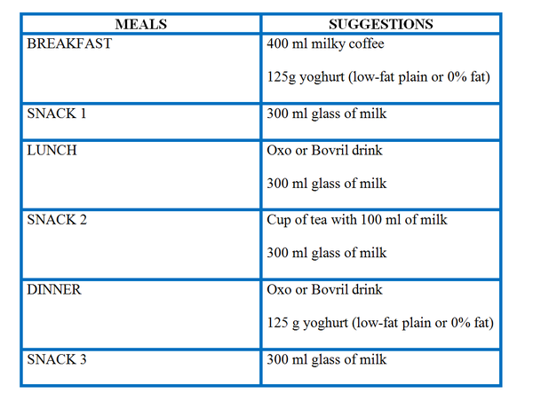- 3 pints of skimmed OR semi skimmed milk OR lacto-free OR soya milk per day. The milk can be hot/cold and flavoured with vanilla essence, SUGAR FREE syrups (e.g. Crusha, Monin).