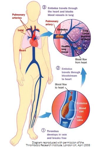 Sometimes the DVT (blood clot) in the leg breaks off and travels to the arteries of the lung where it will cause a pulmonary embolism (PE). PE may cause breathing difficulties and chest pain, and may be fatal.