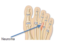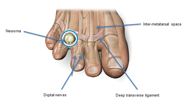 The nerves run in the inter-metatarsal space underneath the deep transverse ligament and divide into two digital nerves. The neuroma in the diagram is positioned in the third - fourth inter-metatarsal space.