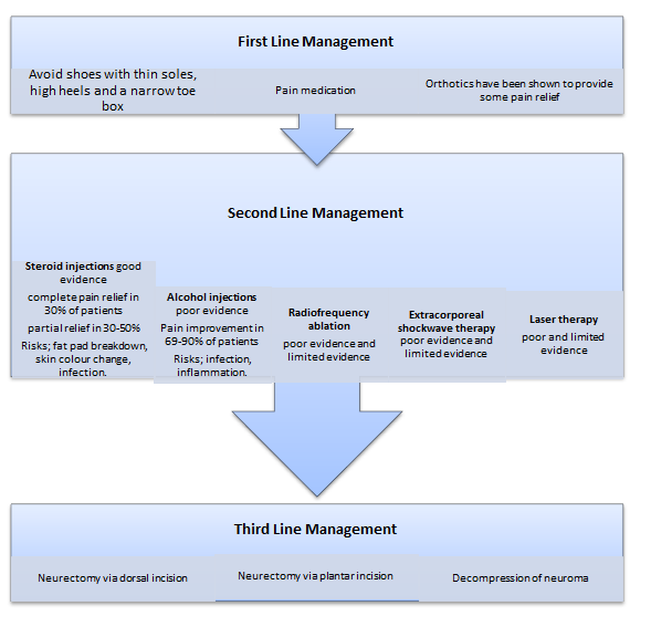 When conservative treatments fail or are unsuitable the neuroma can be treated surgically by either decompressing the nerve or removing it through an incision on the dorsal (top) or plantar (bottom) of the forefoot.