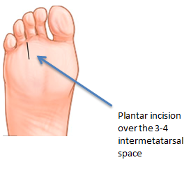 An incision will be made on the plantar (bottom) aspect of your foot over the inter-metatarsal space that the neuroma or neuromas are situated in. The incision is approximately 4cm long.
