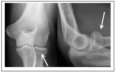 You have a very small break in the radial head or neck – one of the bones in your elbow.