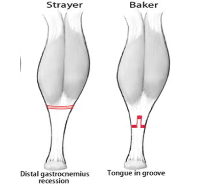 The two common approaches are the Strayer or Baker. Lengthening of the tendon allows normal foot function but the calf is often weaker and smaller than the other side. Rarely the sural nerve is irritated leaving numbness or hypersensitivity to the lower leg.