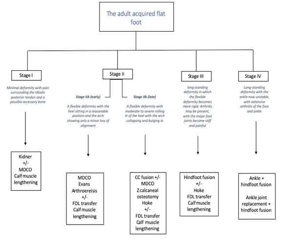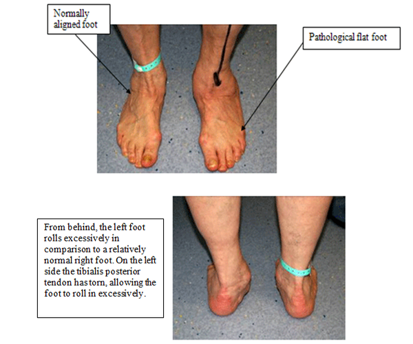 These patients are considered to have a pathological flat foot. In the majority of cases the symptoms respond to stretching exercises, orthoses (shoe inserts) and supportive footwear. If the patient does not respond to conservative treatment, then surgery might be considered.