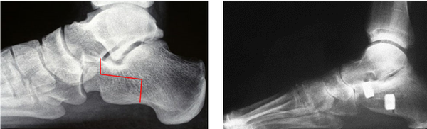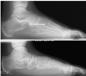 These X-rays show the foot from the side with initially a loss of arch height and a midfoot sag, in a young adult. Post procedure the lateral column has been lengthened using an Evans procedure with a navicular cuneiform fusion.