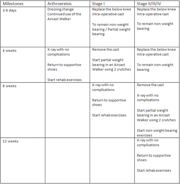 For some patients an additional partial weight bearing cast is applied for 4 weeks. The length of time you are in a cast for depends on the procedure and how well you are healing.