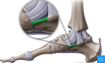 The spring ligament (in green) connects the navicular bone and the heel bone (calcaneus) and helps prevent the foot from collapsing in.